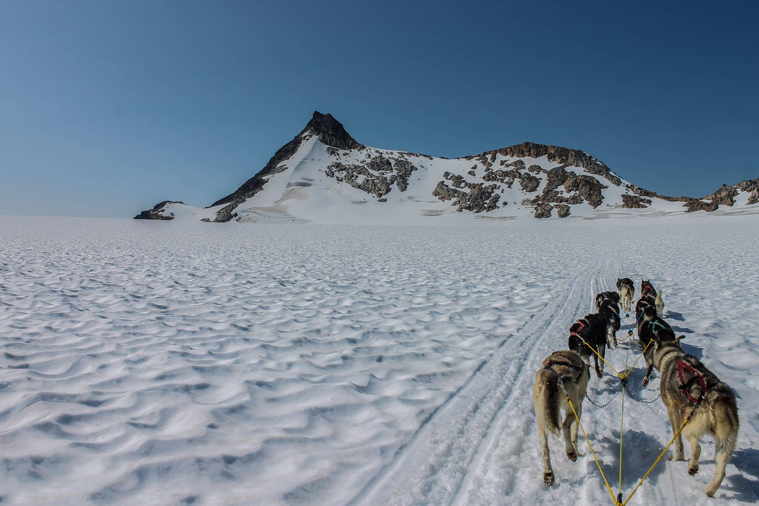 Puis vient le départ. Le traîneau glisse d’abord doucement, jusqu’à ce que l’équipe trouve son rythme. Très vite, on file sur la surface du Punchbowl Glacier, entre ondulations de neige fraîche et couloirs glacés où le vent a sculpté des formes presque graphiques. Lena, debout à l’arrière, guide l’attelage d’une voix calme, ponctuée d’indications courtes. Le souffle des chiens, la glisse des patins, et le sifflement du vent composent un paysage sonore aussi pur que le décor qui nous entoure. Par moments, on aperçoit des crevasses turquoise, ou le reflet du soleil sur une paroi de glace qui scintille comme du cristal.