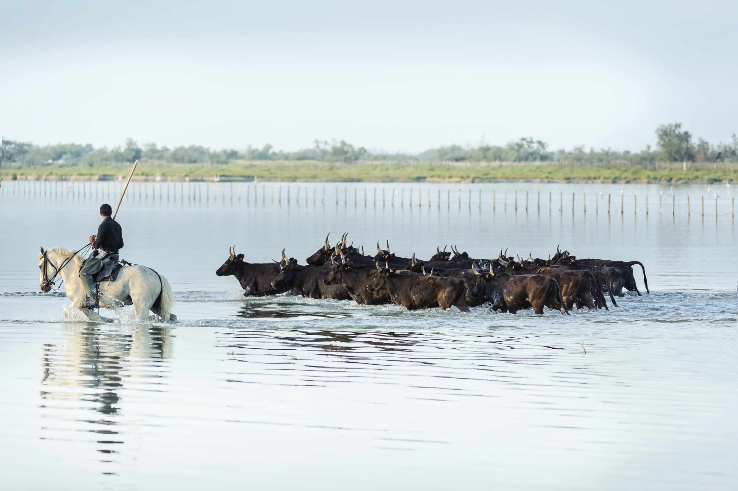 Ici, les taureaux noirs sont élevés pour les courses camarguaises, jeux de bravoure sans mise à mort où l’animal est toujours célébré comme vainqueur. À leurs côtés, les chevaux blancs de race Camargue, montures robustes et endurantes, accompagnent les gardians dans chaque déplacement. Ensemble, ils incarnent une identité régionale unique, fondée sur un lien étroit entre l’homme, ses animaux et son territoire.