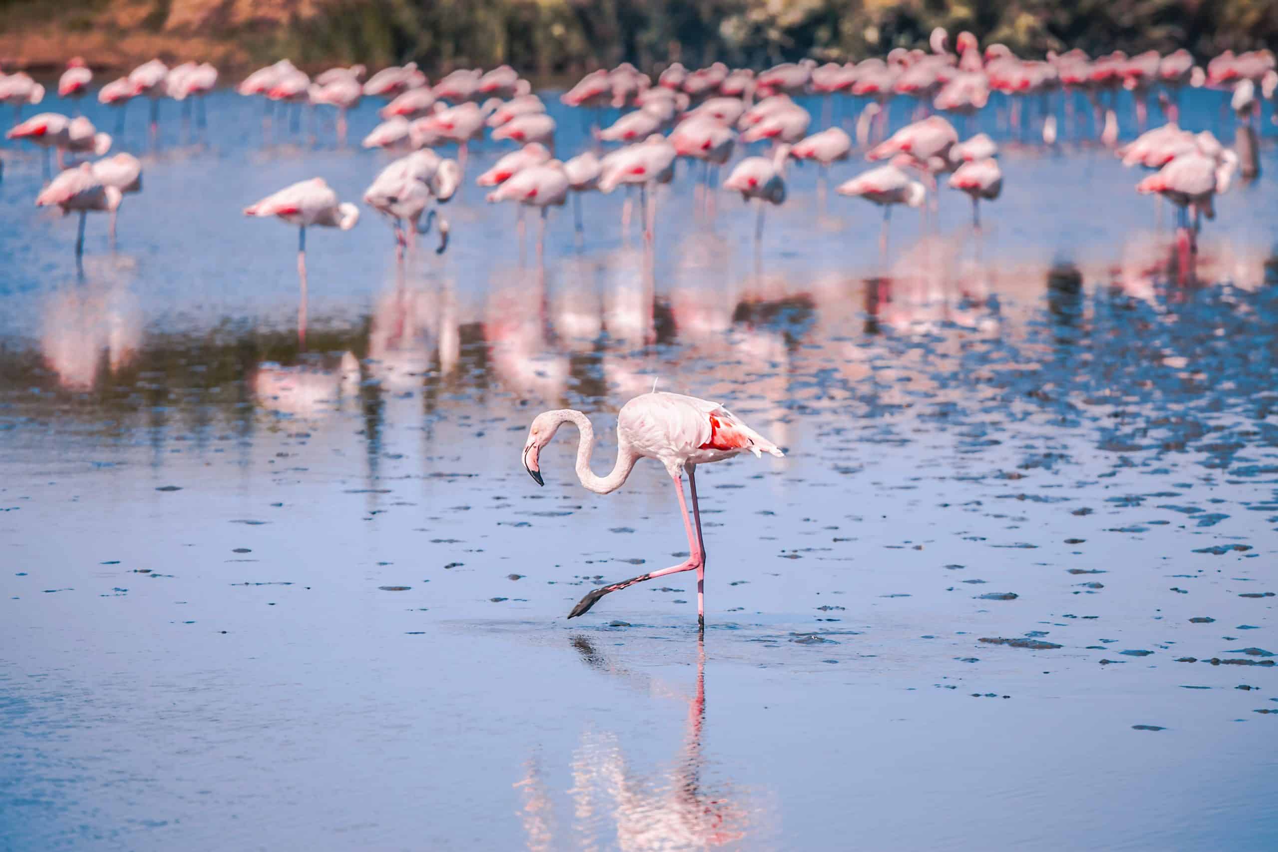 Dans ces paysages singuliers de marais, de lagunes et d’étangs salés, on observe au fil des saisons les flamants roses qui font la renommée de la région. Présents toute l’année, ils se rassemblent par milliers au printemps et en été pour la nidification, offrant un spectacle unique qui complète l’expérience de cette terre où l’homme, le taureau et le cheval vivent en étroite harmonie.