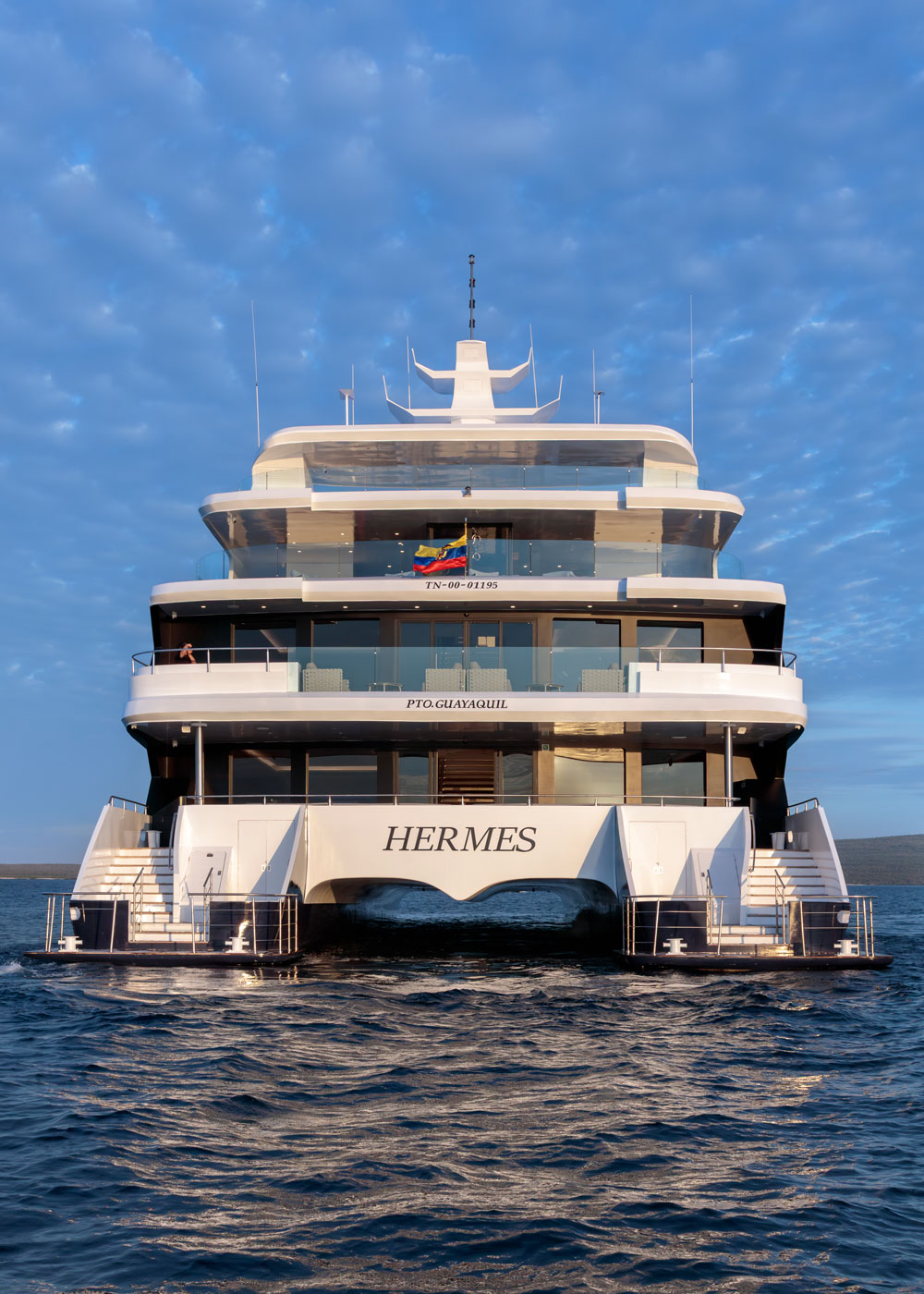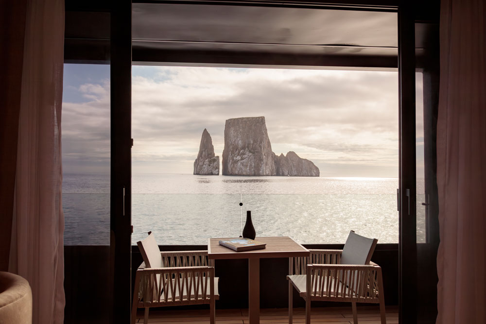 HERMES Galapagos accueille un nombre très limité de passagers dans l’une de ses 12 suites panoramiques, entre 35 et 60 m², toutes conçues comme de véritables cocons ouverts sur l’océan. Les larges baies vitrées pleine hauteur offrent une vue exceptionnelle sur les paysages volcaniques et les eaux turquoise des Galápagos.
